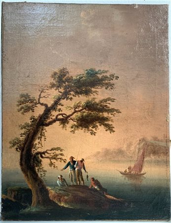 Ignoto "Pescatori al tramonto" olio su tela (cm 44x34) (difetti e mancanze)