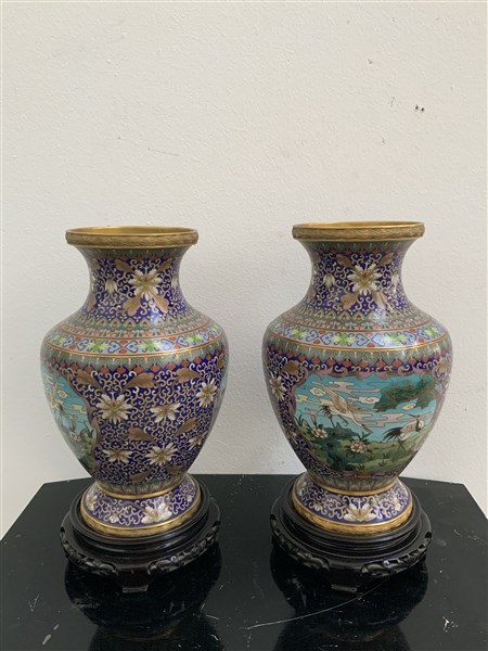 Coppia di vasi in smalto cloisonné con riserve decorate con gru e fiori, basi in legno