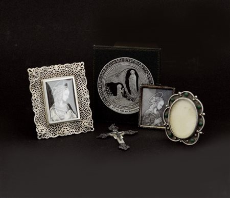 Lotto composto da tre cornicette diverse, una placca ed un crocefisso in argent
