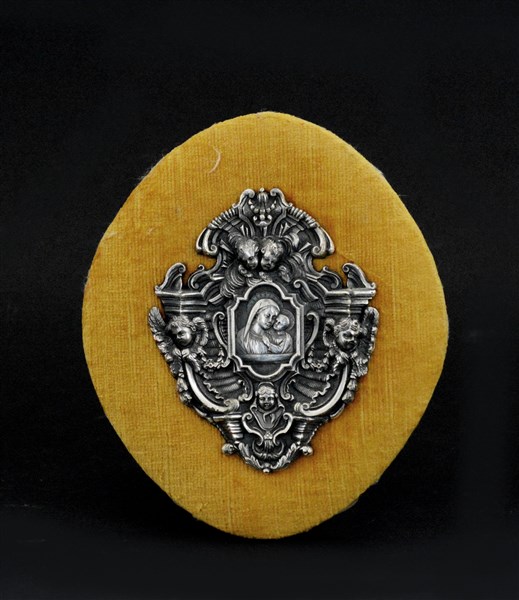 Piccola placca in argento sbalzato di forma sagomata decorato a volute, festoni e teste di cherubini, al centro madonna con bambino. Montata su pannello in velluto, secolo XIX (cm 12x10) (lievi difetti)