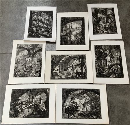 Giovanni Battista Piranesi, gruppo di otto incisioni della serie "Carceri", tiratura tarda (fogli cm 73x54 circa) (difetti)
