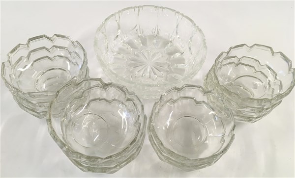 Lotto composto da una grande ciotola e dieci coppette da macedonia in vetro molato (lievi difetti)