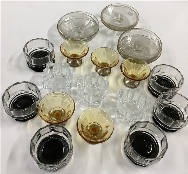 Lotto composto da nove portalumini, cinque coppette con base in metallo e dieci bobeche in vetro, misure diverse (lievi difetti)