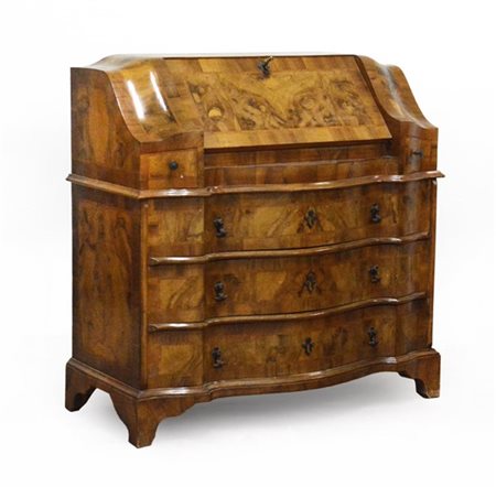 Ribaltina in stile interamente lastronata in noce e radica di noce e filettata, anta ribaltabile celante quattro cassettini e sportello, due cassetini laterali, fronte sagomato a tre cassetti (cm 105x104x52) (difetti e mancanze)