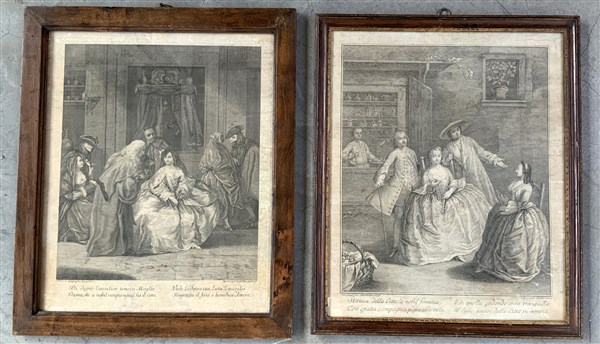 Coppia di incisioni, da invenzioni di Pietro Longhi, raffiguranti "Scene di vita veneziana" (cm 46x37 all'impronta). In cornici (difetti)