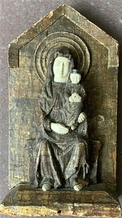 Altorilievo raffigurante Madonna con Bambino in legno e avorio, tracce di doratura (h. cm 48) (mancanze)
