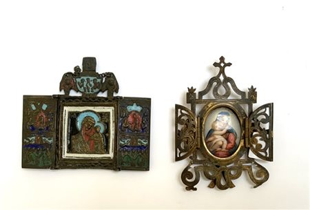 Lotto composto di una miniatura su porcellana raffigurante Madonna con Bambino entro cornice in metallo e un'icona da viaggio con Madonna, Bambino e Santi (h max xm 11,5) (difetti)