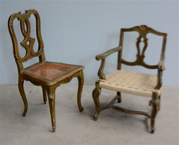 Lotto di una sedia ed una poltroncina con schienali a giorno in legno laccato verde e dipinto a forellini (difetti)