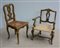 Lotto di una sedia ed una poltroncina con schienali a giorno in legno laccato v