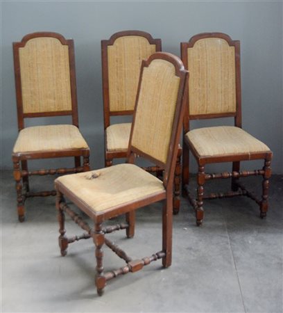 Gruppo di quattro sedie con gambe anteriori e traverse tornite a rocchetto (difetti)
