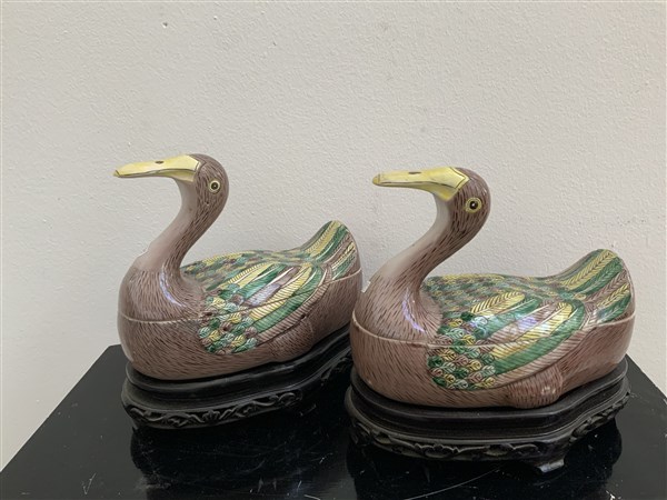 Coppia di scatole in porcellana a forma di papera, base in legno Cina, sec.XX (