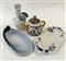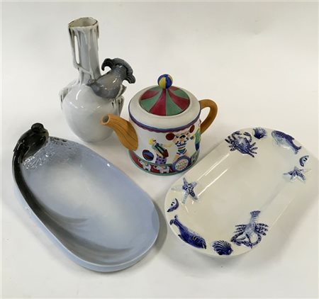 Lotto composto da due vassoietti ed un vaso in porcellana decorati con animali in rilievo ed una teiera in ceramica con decoro ispirato al circo (difetti)