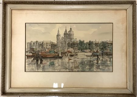 "Amsterdam" tecnica mista su carta (cm 22x38.5) Firmato e locato in basso a sinistra. In cornice