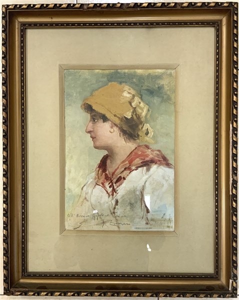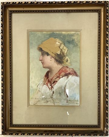 "La popolana" olio su cartone (cm 33x23) Dedicato ed iscritto in basso a sinistra e firmato in basso al centro. In cornice