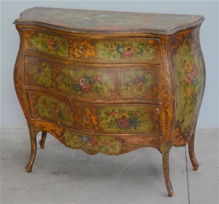 Comò a tre cassetti di forma mossa e bombata in legno laccato e dorato dipinto a fiori e motivi vegetali (cm 100x87x45) (difetti)