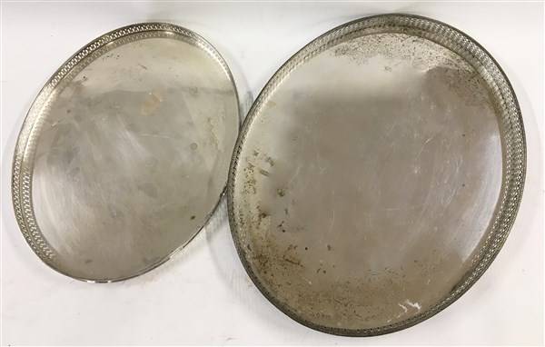 Lotto di due vassoi ovali in metallo argentato con bordi traforati, misure diverse (difetti)