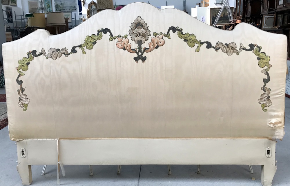 Lotto composto da una testata di letto confezionata con ricamo settecentesco in seta di fili dargento riportate su raso mohair colore beige e da un copriletto in seta beige con applicato un ricamo in seta e fili di metallo dorato con medesimo decoro. (cm 83x183) (lievi difetti)