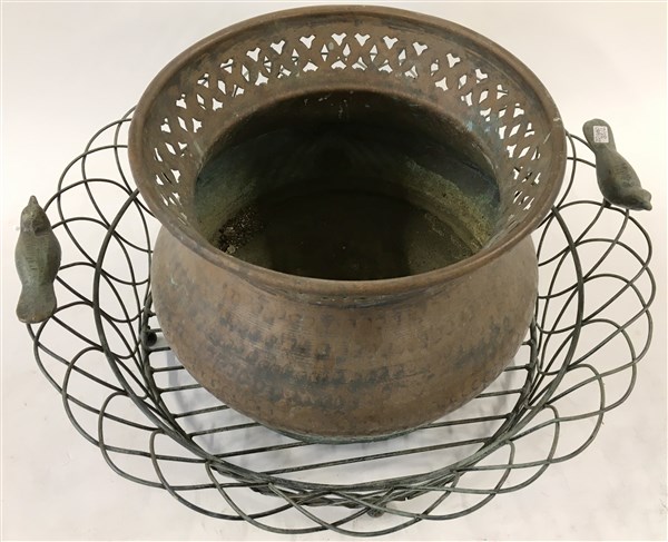 Lotto composto da una fioriera in ferro decorata con volatili a tutto tondo ed un contenitore in rame. Misure diverse (difetti)