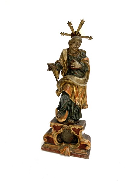 "Madonna della mandorla" scultura in legno decorata in policromia poggiante su base mossa con cera (h cm 33,5) (difetti)