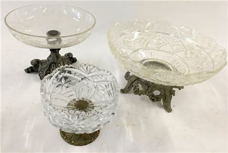 Lotto di tre alzatine diverse con basi in metallo e argento e piani in cristallo molato (h max cm 14) (difetti)