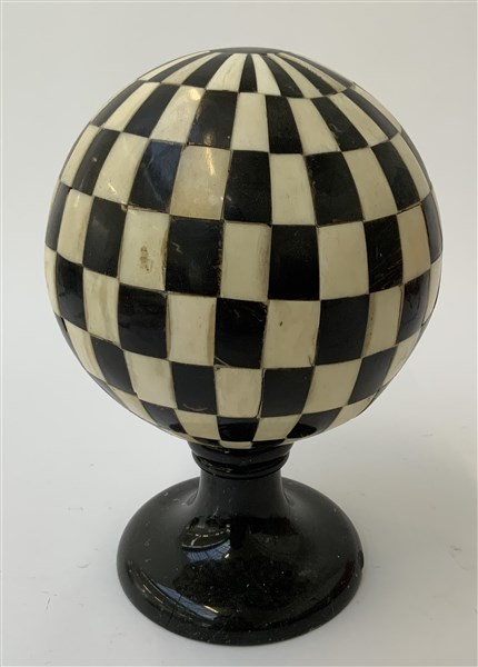 Sfera decorata con tessere in osso bianco e nero su basamento in marmo (h cm 30) (difetti)