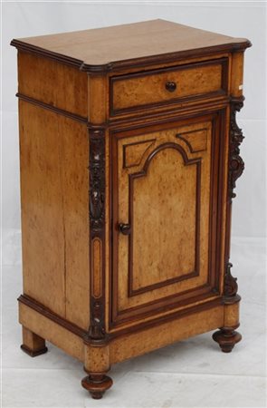 Comodino lastronato ad un cassetto ed un'anta con montanti intagliati a mascher