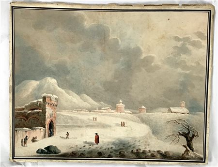 Ignoto "Paesaggio invernale" gouache su carta applicata su cartone (cm 40x50,5)