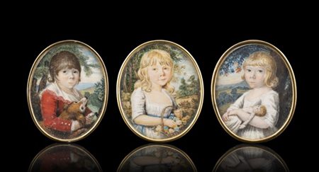 Scuola inizio secolo XIX "Fanciulle" gruppo di tre miniature ovali (cm 6x4,5) I