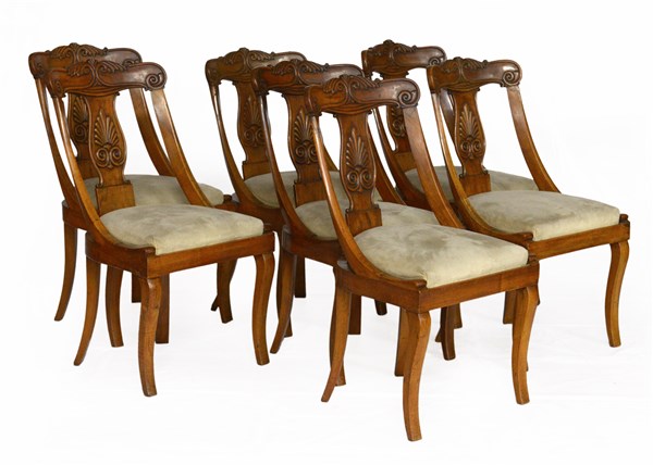 Gruppo di sette sedie a gondola in noce, schienale a giorno intagliato a motivi vegetali, gambe mosse.Lombardia secolo XIX (difetti)