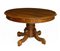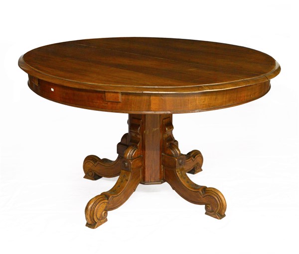 Tavolo con piano tondo allungabile in noce, gamba centrale ottagonale terminante a quattro piedi sagomati ed intagliati. Fine secolo XIX. (d cm 130 x h cm 77) munito di due prolunghe non coeve