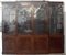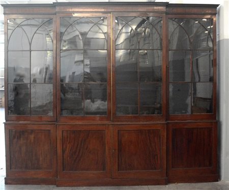 Libreria a due corpi in noce, parte superiore a quattro ante a vetri decorate da listelli terminanti ad ogiva, parte inferiore a quattro ante riquadrate, cappello aggettante, Inghilterra secolo XIX (cm 310x260x35) (difetti)