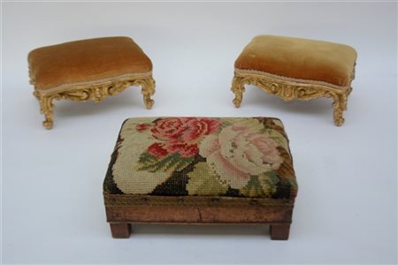 Lotto composto da tre poggiapiedi del sec. XIX di cui due in legno intagliato e dorato e uno rivestito in tessuto a mezzo punto, misure diverse(max cm 36x14x25) (difetti)
