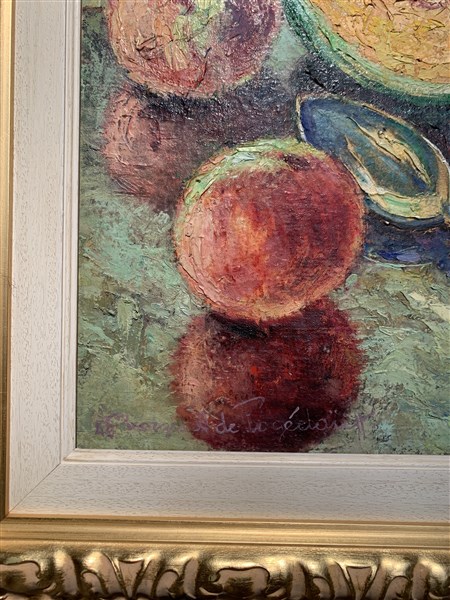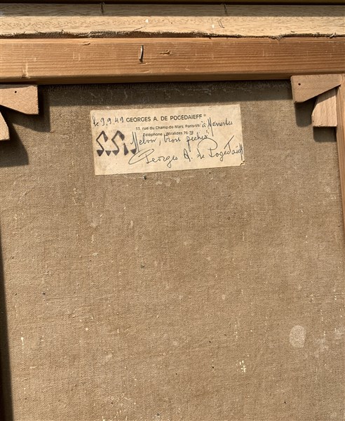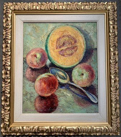 Georges De Pogedaieff Anatolevich "Melone, tre pesche" 1949 olio su tela (cm 46,