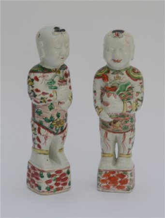 Due toys in porcellana policroma decorati in smalti Famiglia Verde. Cina, sec. XVIII/XIX (h. cm 26 e 27) (difetti e mancanze)
