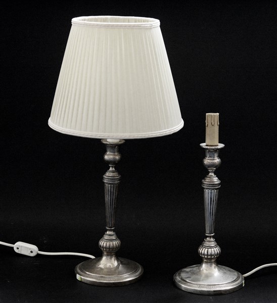 Coppia di candelieri scanalati, argentiere Miracoli, montati a luce elettrica, una con paralume, titolo 800 (h cm 30) (difetti)