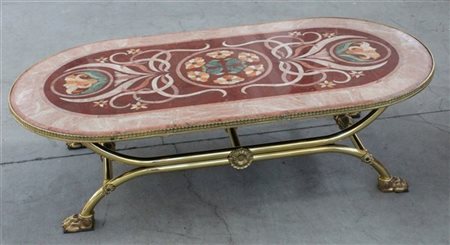 Tavolo da salotto di forma ovale con piano intarsiato in marmi vari a volute e motivi floreali, gambe in bronzo terminanti a piedi ferini (cm 140x39x76) (lievi difetti)
