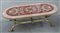Tavolo da salotto di forma ovale con piano intarsiato in marmi vari a volute e