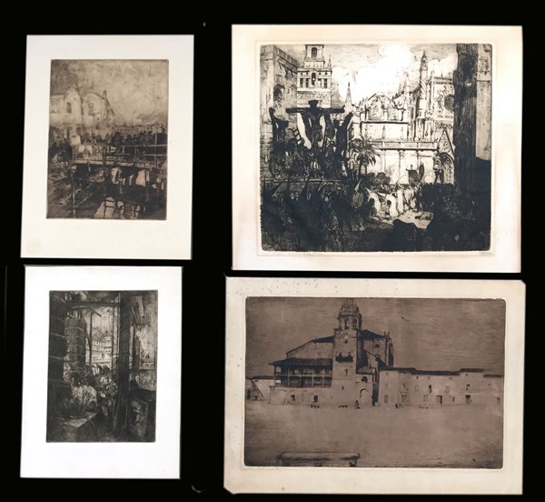 Quattro acqueforti raffiguranti "Siviglia, la processione del venerdì santo" "Ronda, casette bianche" "Veduta di canale con ponte e figure" e "Scorcio" (mm 400x450; mm 430x590; mm 322x240; mm 295x214). Due firmate, numerate e titolate a matita.