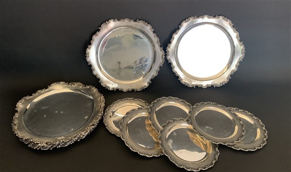 Lotto composto da sei sottopiatti e sei piattini da pane in argento con bordi decorati a volute (g 3800 circa) (difetti)