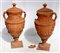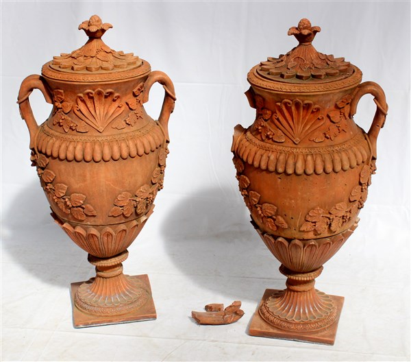 Coppia di vasi biansati con coperchio in terracotta decorata a tralci di uva, p