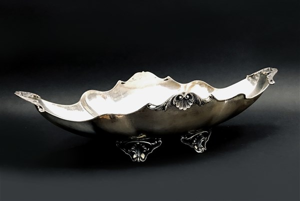 Centrotavola in argento con profilo polilobato, decori applicati a volute e conchiglie (g 1000) (l cm49)