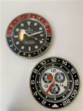 Lotto di due orologi da parete da esposizione di cui uno di tipo "ROLEX",con me