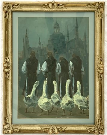 "La strada per la Certosa" olio su masonite (cm 80x49.5) Firmato in basso a sinistra. Al retro: Firmato, titolato ed iscritto. In cornice