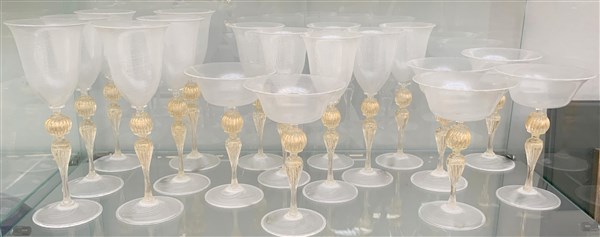 Lotto composto da sei bicchieri d'acqua, sei coppe da champagne e sei bicchieri da vino in vetro soffiato incolore a mezza filigrana lattimo e trasparente incolore, fusto con inclusione di foglia d'oro. Secolo XX. (lievi difetti)