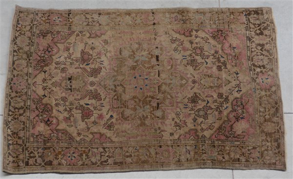 Decoro con medaglione polilobato con puntali nei toni del rosa, azzurra e nocciola chiaro su fondo bianco (cm 145x97) (Difetti)