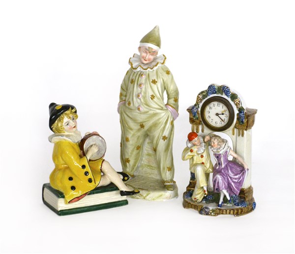 Lotto composto da un orologio da tavolo e due scultura in porcellana e bisquit decorati in policromia raffiguranti figure in maschera (H max cm 32) (difetti, restauri e mancanze)