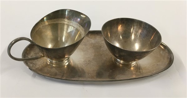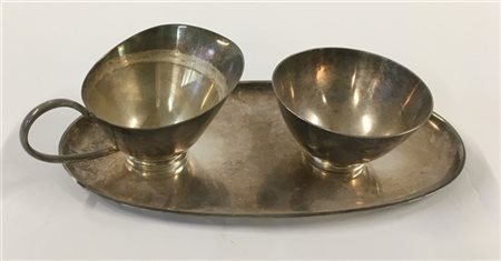 Lotto composto da una tazzina, un piccolo versatoio e un vassoio in metallo argentato. Italia, anni '50. (lievi difetti)