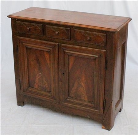 Credenza a due ante e fianchi riquadrati, tre cassetti sottopiano con pannelli a sagoma (cm 124x110x50) (difetti)
