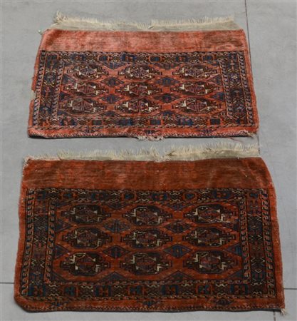 Lotto di due tappeti Yomut Chuval, Turkestan occidentale, fine secolo XIX. Decoro con Gul su fondo rosso scuro. (114x76 110x72) (difetti, mancanze, rotture e rapature.)