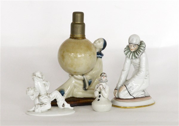 Lotto composto da una lampada da tavolo, un portaprofumo e due sculture raffiguranti Pierrot di epoche e manifatture differenti. (h max cm 22) (lievi difetti)
